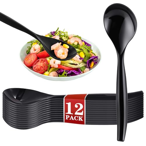 Mwellewm 10" Serving Spoons Plastic Serving Utensils 12 Packs Disposable Spoons for Buffet Large Heavy Duty Black Plastic Soup Spoons Catering Supplies for Parties Weddings Gatherings Holiday