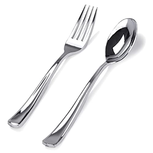 BUCLA 200 Pieces Silver Plastic Silverware - Heavy Duty Disposable Cutlery set - 100 Silver Plastic Forks, 100 Disposable Spoons for Catering, Parties, Dinners, Weddings and Christmas