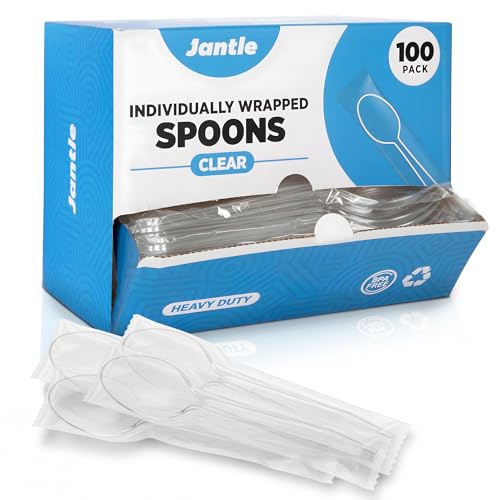 Individually Wrapped Heavy Duty Plastic Spoons with Dispenser Box, Black Disposable Spoons 100 Pack - Disposable Utensils for Home, Office, Restaurant, Catering, To-Go Meals - 100 Count (Clear)