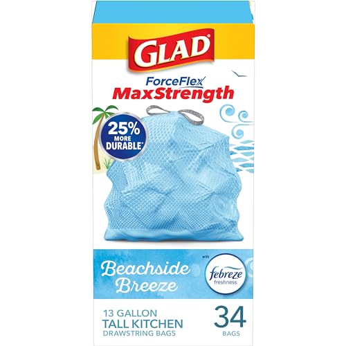 Glad Tall Kitchen Trash Bags 13 Gallon, MaxStrength Beachside Breeze Garbage Bags, Odorshield with Drawstring, 34 Count