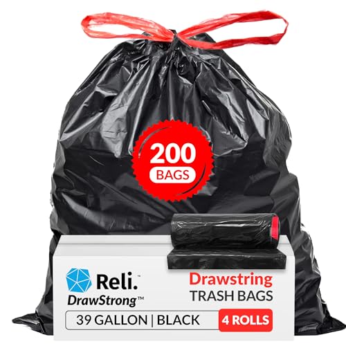Reli. 39 Gallon Trash Bags Drawstring (200 Count Bulk) Large 39 Gallon Heavy Duty Drawstring Trash Bags - Black Garbage 39Gal Capacity, Lawn Leaf (39Gal)