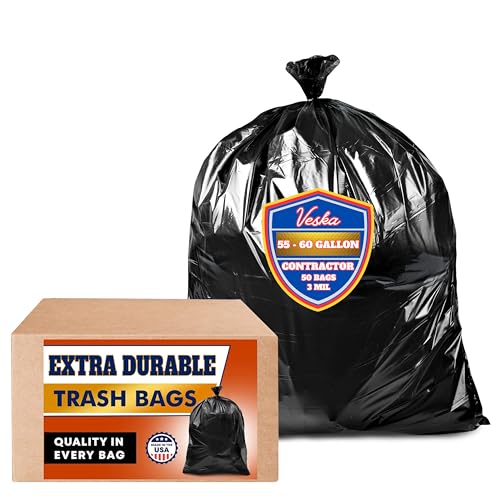 Veska Contractor Garbage Bags 55 Gallon 3 MIL Heavy Duty (MegaValue 50 Bags w/Ties) Contractor Trash Bags 50-60 Gallon 3 Mil Contractor Bag Heavy Duty 55 Gallon, Extra Large Industrial Contractor