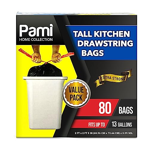 PAMI Tall 13-Gallon Kitchen Drawstring Trash Bags [80-Pack, Black] - Extra-Strong Plastic Garbage Bags- Thick Trash Can Liners For Kitchen, Bathroom & Outdoor Bins- 2ft x2ft Unscented Trash Bags