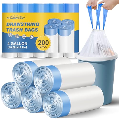Charmount Small Trash Bags 4 Gallon, 200 Count Drawstring Mini Garbage Bags, Plastic Trash Can Liners for Bathroom Accessories, Bedroom, Dorm Room Essentials, Office