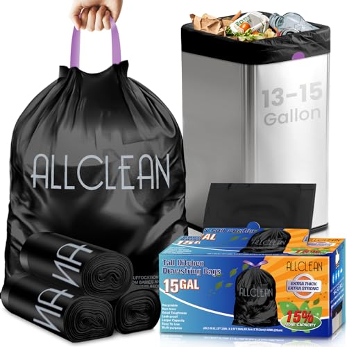 Trash Bags 15 Gallon Tall Kitchen Drawstring Garbage Bags,Fit 13-15 Gal Bins,Extra Strong&Leak-Proof,Unscented&Recyclable Trash Can Liners for Home Office Industrial Bathroom Garden Lawn(Black)