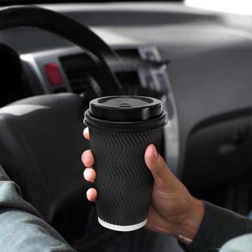 100 Pack 16 oz Coffee Cups with Lids, Disposable Insulated Hot Cups To Go Paper Coffee Cups, Corrugated Ripple Wall Cup for Hot Drink, Office, Coffee Bar (Black 16 oz)
