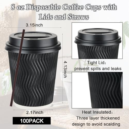 100 Pack 8 oz Disposable Coffee Cups with Lids and Straws, To go Insulated Corrugated Thick Paper Coffee Cups for Hot/Cold Beverages, Ripple Wall Cups for Espresso Coffee, Hot Chocolate and Cocoa