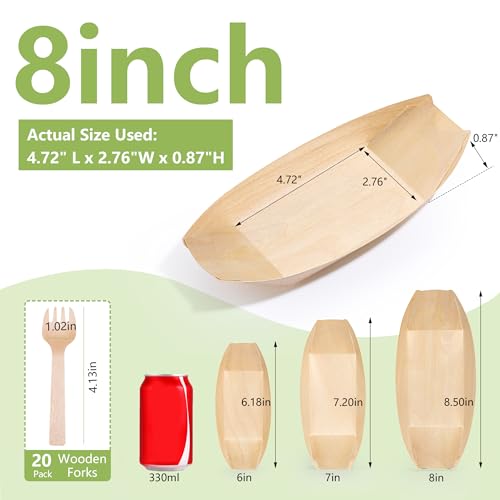 100-Pack Upgraded Thick Wooden Disposable Plates 8IN Thickened Boat Plates Food Trays with 1.1lb/495g Load Capacity Sturdy Food Boats for Party (Actual Size Used: 4.72"L x 2.76"W x 0.87"H)