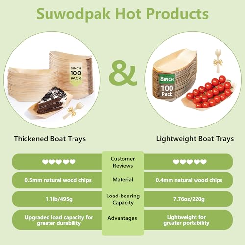 Brand Name: Suwodpak | Color: 8 INCH | Finish Types: Glossy | Included Components: 8IN 100-Pack Boat Tray | Is the item dishwasher safe?: No | Is the item microwaveable?: No | Item Dimensions L x W x Thickness: 1"L x 1"W x 1"Th | Item Weight: 1.06 Kilograms | Manufacturer: Suwodpak | Manufacturer Part Number: Thickened Boat Food Tray | Material Features: Biodegradable, Compostable | Material Type: Wood | Model Number: Thickened Boat Food Tray | Number of Pieces: 100 | Other Special Features of the Product: Disposable | Pattern: Wood Texture | Shape: Boat | Size: 100-Pack | Style Name: Modern, Rustic | Unit Count: 1.0 Count