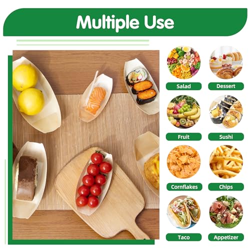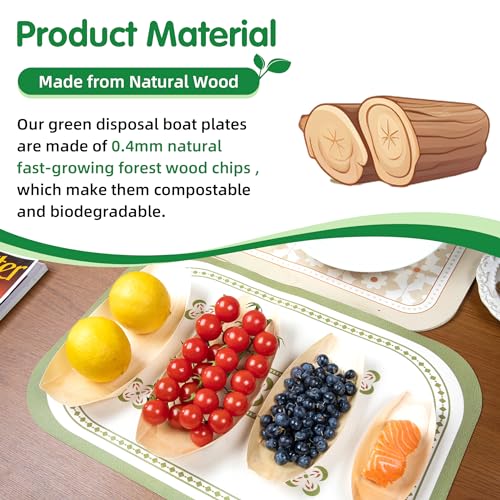 100-Pack Wooden Disposable Plates 8 IN Boat Plates Food Trays Disposable Dessert Plates Disposable Food Boats for Party Weddings Picnic (Actual Size Used: 4.72" D x 2.76" W x 0.87" H)