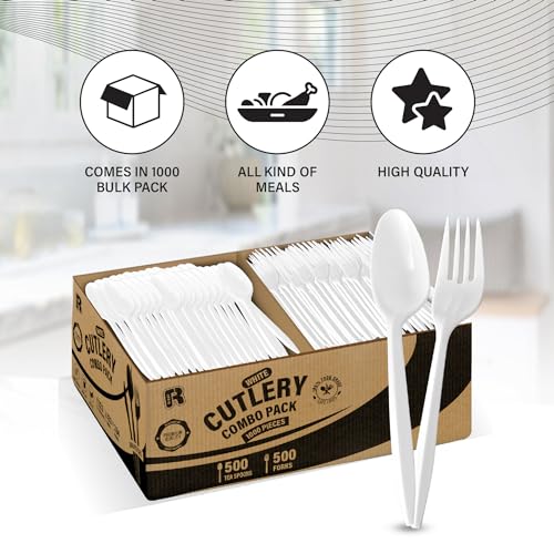 1000 Pcs Plastic Utensils Set - 500 Forks And 500 Spoons - Premium Plastic Forks And Spoons - Medium Weight Silverware Set - Bulk Disposable Cutlery