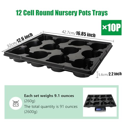 Brand Name: RooTrimmer | Capacity: 1.5 Cups | Color: Black | Included Components: Tray | Item Type Name: 12 Cell Nursery Pots Trays | Item Weight: 250 Grams | Manufacturer: RooTrimmer | Manufacturer Part Number: 12 Cell Round Nursery Pots Trays-10P | Material Type: Plastic | Number of Pieces: 120 | Other Special Features of the Product: Drainage Hole | Pattern: Solid | Product Style: Garden | Shape: Rectangular | Size: 12 Cell Trays for 4 Inch Pots-10 Pack