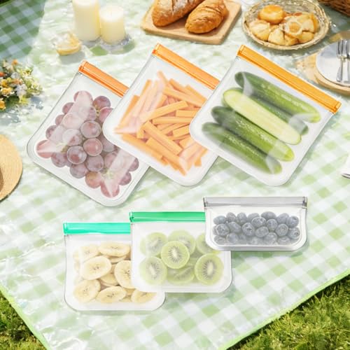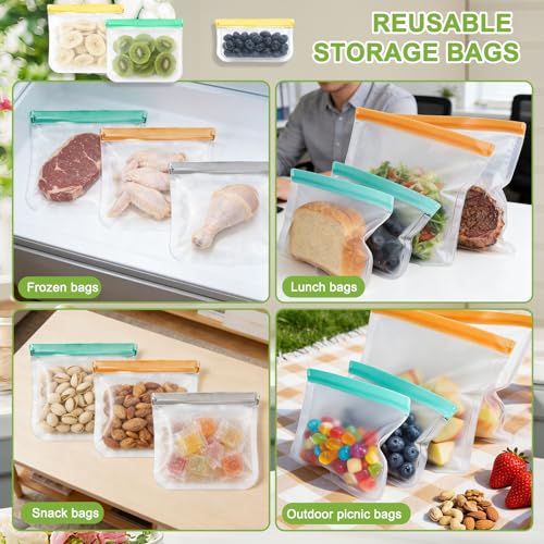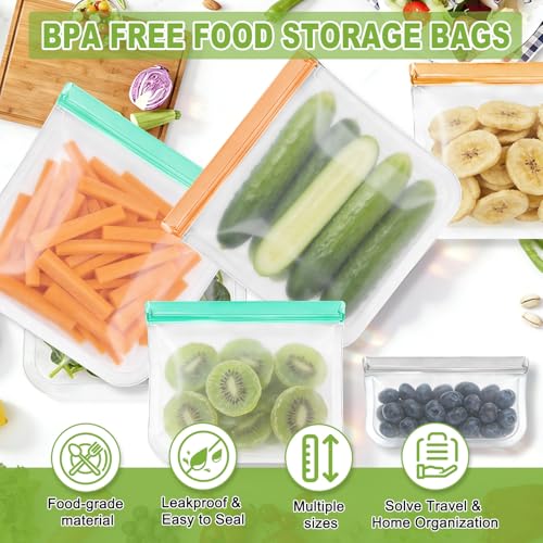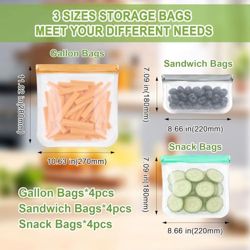 12 Pack Silicone Bags for Food Storage,Freezer,Microwave & Dishwasher Safe,Leakproof Food Storage Bags,Reusable Freezer Ziploc Bags,Sandwich Snack Baggies-4 Gallon 4 Snack 4 Sandwich Bags,3 Colors
