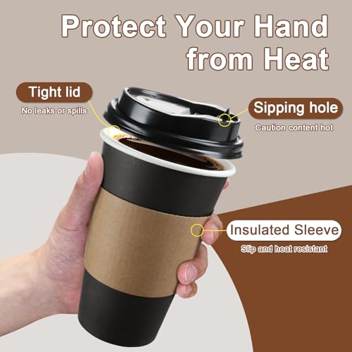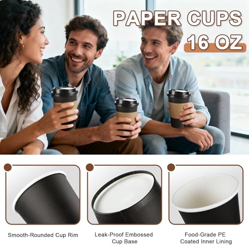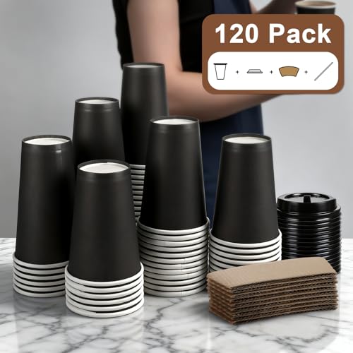120 Pack 16 oz Paper Coffee Cups Set, Disposable Black Coffee Cups with Lids, Sleeves and Stirring Sticks, Fit For Cold and Hot Drinks