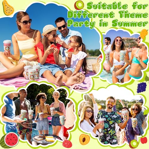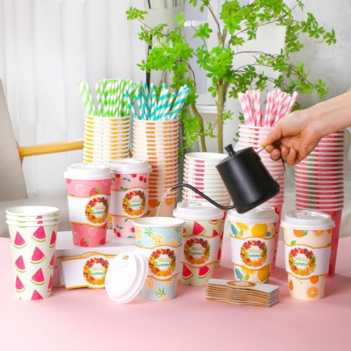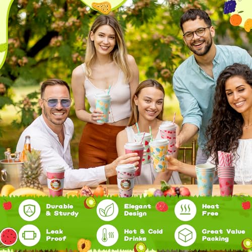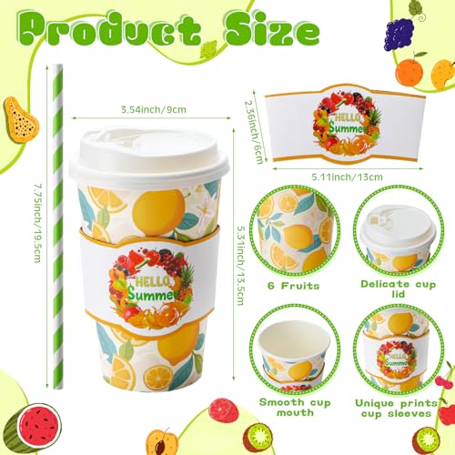 120 Sets 16oz Disposable Paper Coffee Cups with Lids Sleeves Straws Holiday Paper Drinking Cups Bulk for Hot Cold Beverages Home Business Cafe Birthday Party Supplies (Fruits)