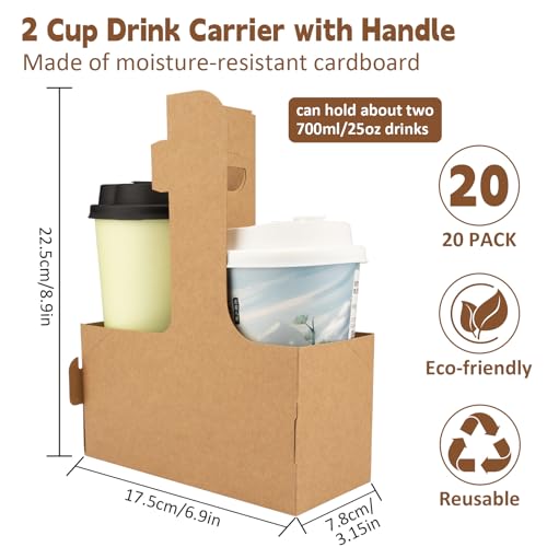 2 Cup Drink Carrier with Handle,Pack of 20 Kraft Paperboard Take Out Cup Carriers,Portable Foldable Cup Carrier for Hot or Cold Drinks,Coffee Carrier, Food Delivery (Brown)