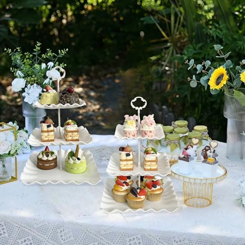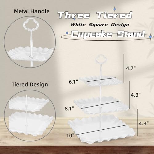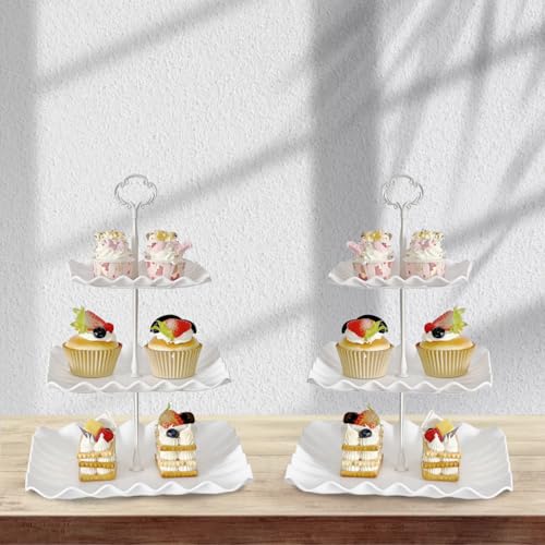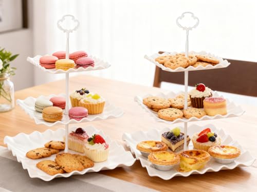 2 Pack of Plastic Square Dessert Cupcake Stand, 3 Tier Cup Cake Holder Tower for Tea Party/Birthday/Wedding, Plastic Tiered Serving Tray (White)