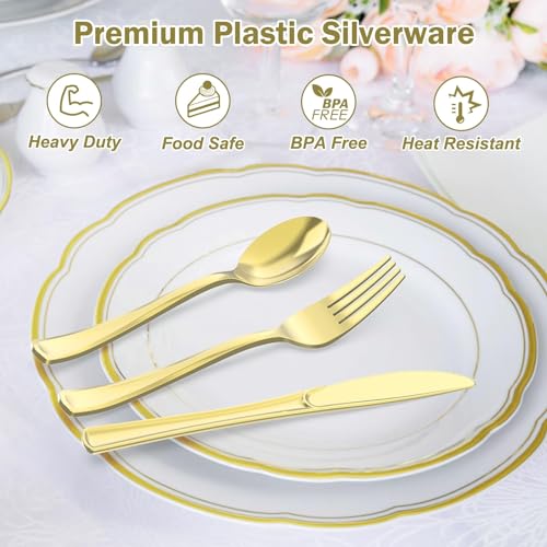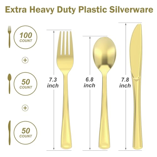200 Count Heavy Duty Gold Plastic Silverware, 100 Forks, 50 Spoons, 50 Knives, BPA-Free, Heat Resistant, Disposable Plastic Utensils Set Cutlery Set, Plasticware Bulk
