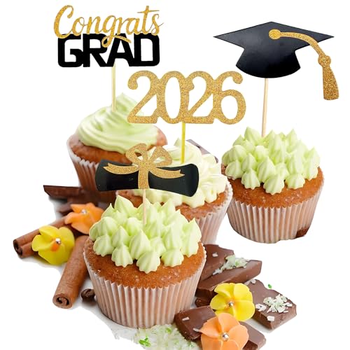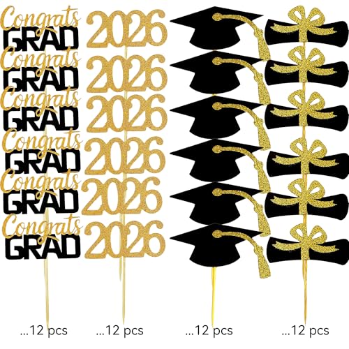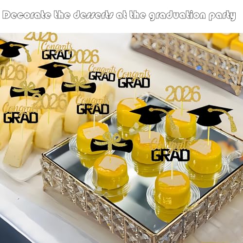 2026 Graduation Cupcake Toppers, 48 PCS Food/Appetizer Picks For Graduation Party Mini Cake Decorations, Diploma, 2026, Grad Cap Set 48 Pieces (01 Gold)