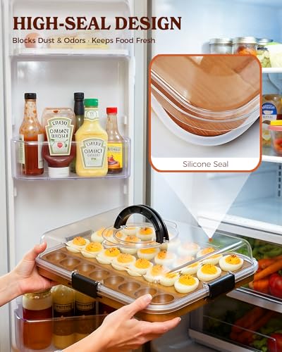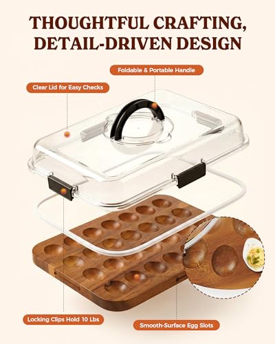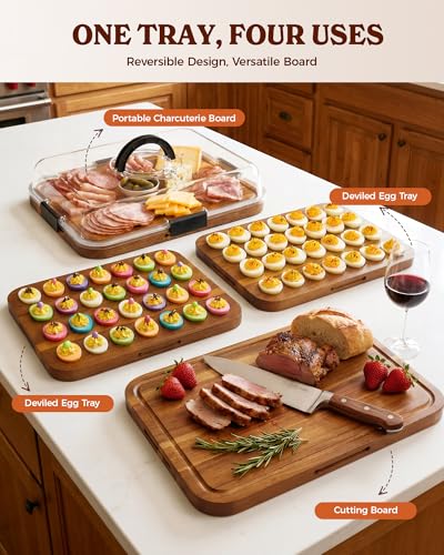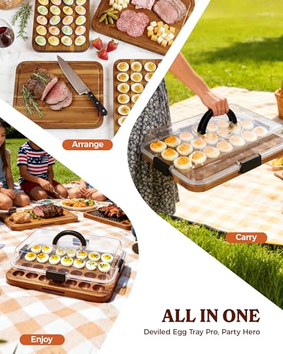 2026 Upgraded Easter Acacia Wood Deviled Egg Containers with Lid, Portable Deviled Egg Platter Tray with 28 Slots for Easter, Party & Picnic, Reversible Charcuterie Board, House Warming Gifts New Home