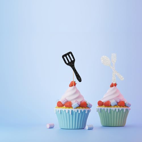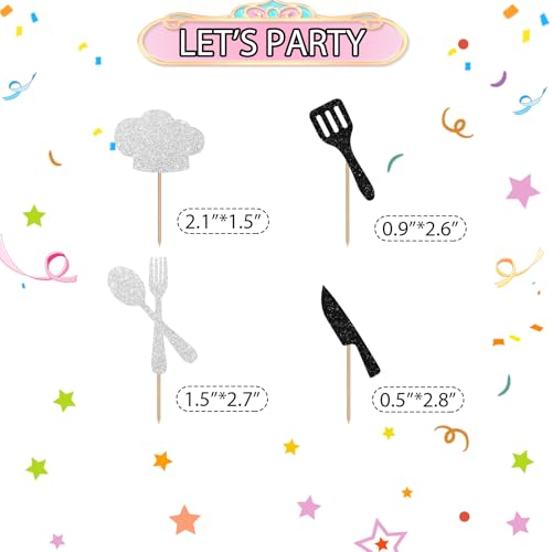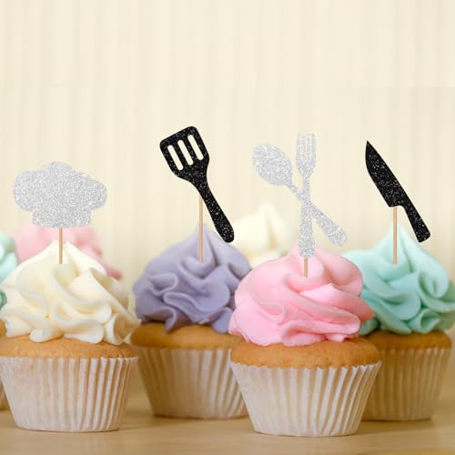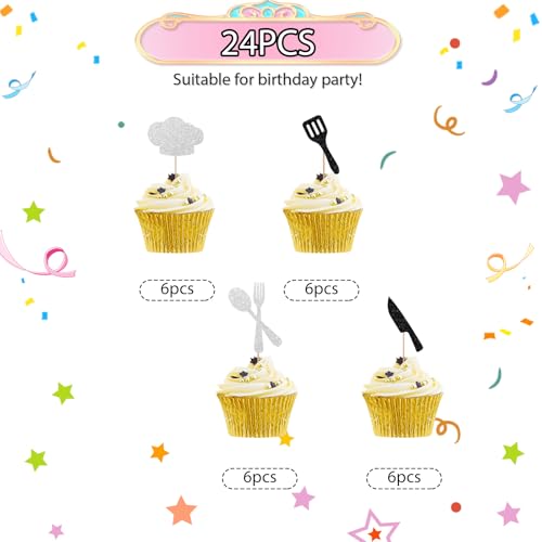 24pcs Chef Cupcake Toppers, Cooking Chef Cupcake Toppers for Masterchef Birthday, Black Glitter Cooker Cupcake Picks, Cook Themed Birthday/Baby Shower Party Supplies