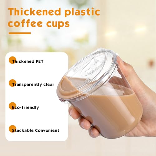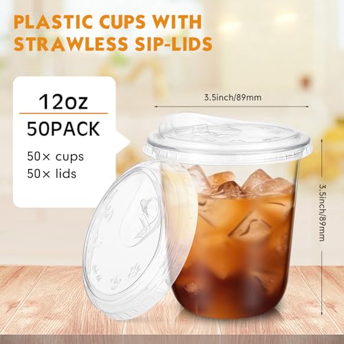50 Sets 12 oz Clear Plastic Cups with Strawless Sip Lids, Thickened Clear Disposable Plastic PET Crystal Cups for Iced Coffee, Smoothie, Cold Beverage, Drink Shops and Party Catering