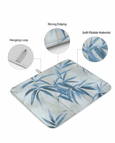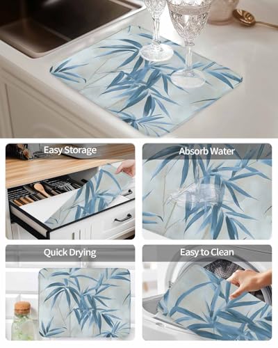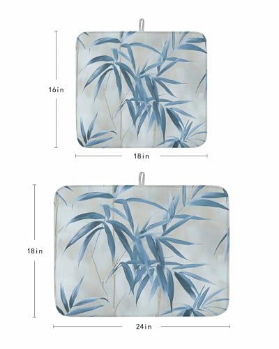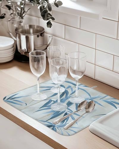 Abstract Bamboos Leaf Dish Drying Mat for Kitchen Counter Blue Branch Leaf Watercolor Absorbent Microfiber Quick Dry Pad Non Slip Drainer Mats 16x18 Inch, 2 Pack