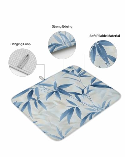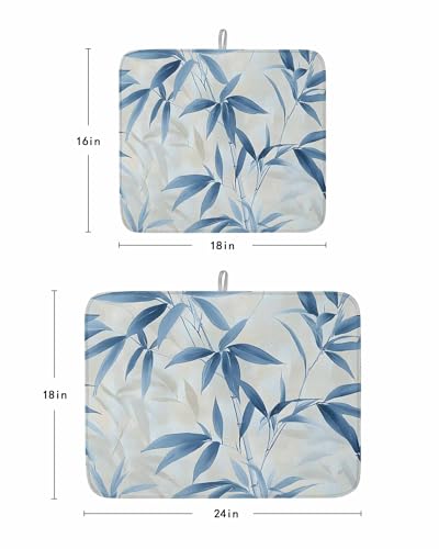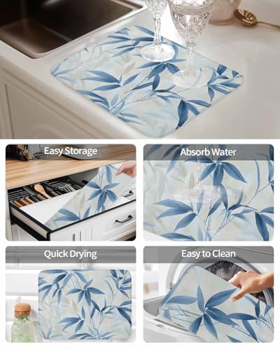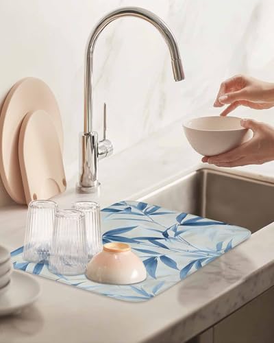 Abstract Bamboos Leaf Dish Drying Mat for Kitchen Counter Blue Branches Leaves Watercolor Absorbent Microfiber Quick Dry Pad Non Slip Drainer Mats 16x18 Inch, 1 Pack