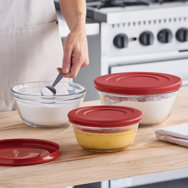 Anchor Hocking Glass Mixing Bowl Set with Red Plastic Lids 92224L20 - 3/Set