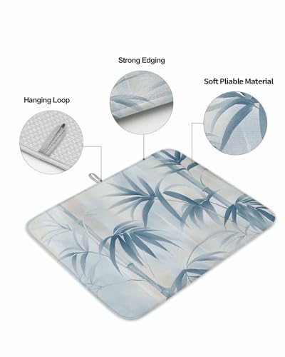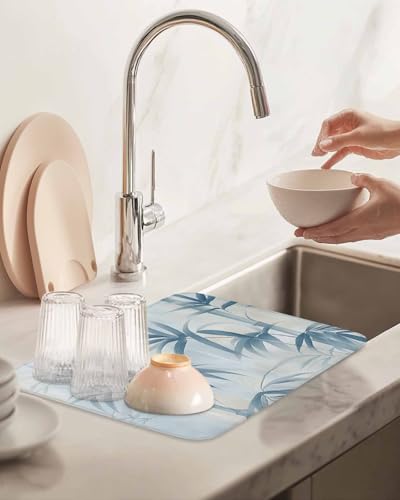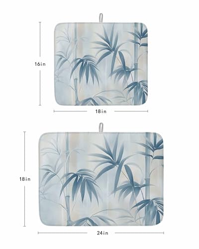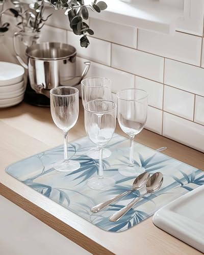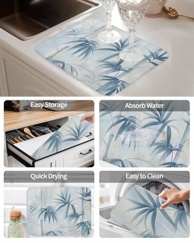 Bamboos Leaf Dish Drying Mat for Kitchen Counter Blue Leaves Watercolor Modernism Absorbent Microfiber Quick Dry Pad Non Slip Drainer Mats 16x18 Inch, 2 Pack