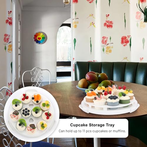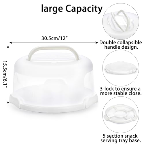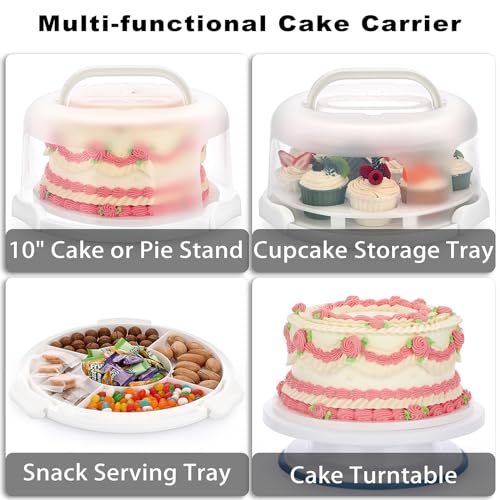 BSTKEY Portable Cake Carrier with Lid and Handle, Cake Turntable + Cupcake Storage Tray for Transport, 10" Round Cake Container Holder with Two Sided Base for Pies Nuts Fruit Cookies, White