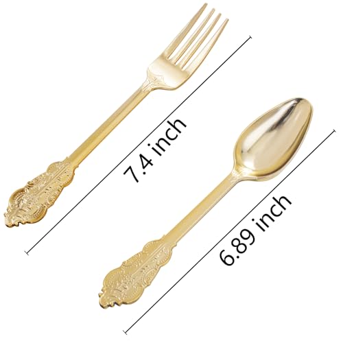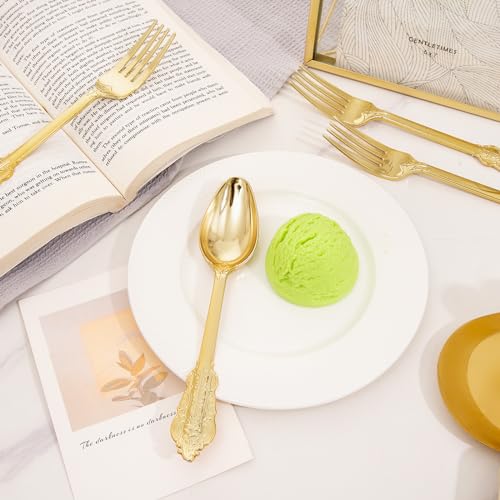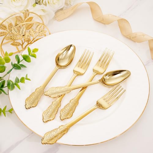 BUCLA 200 Piece Gold Plastic Silverware - Baroque Style Gold Plastic Forks and Spoons - 100 Forks and 100 Spoons for Weddings, Parties & Thanksgiving