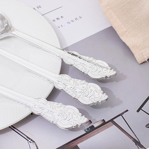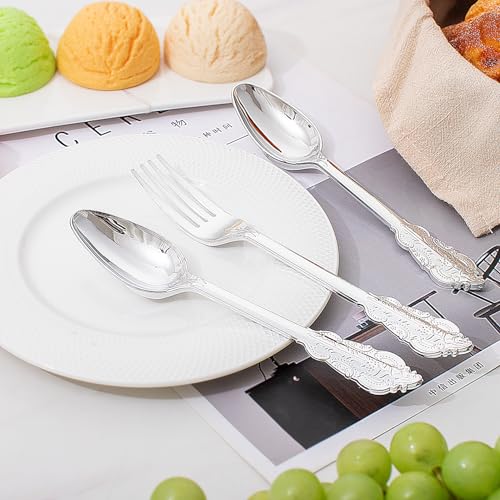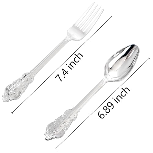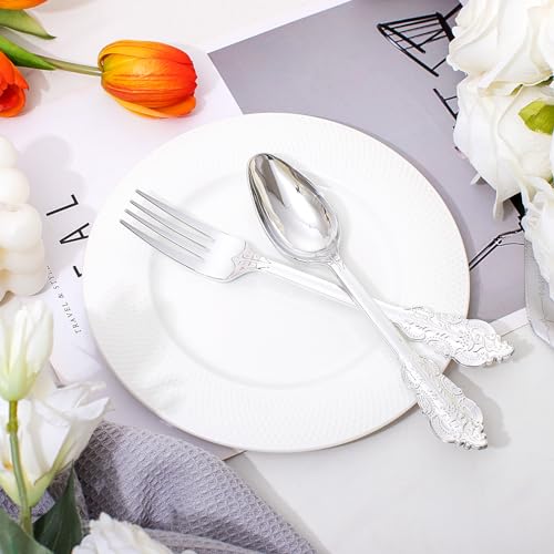 BUCLA 200PCS Silver Plastic Forks and Spoons - Plastic Silverware Baroque - Disposable Silverware Heavy Duty - 100PCS Silver Forks and 100PCS Spoons for Weddings, Christmas and Party