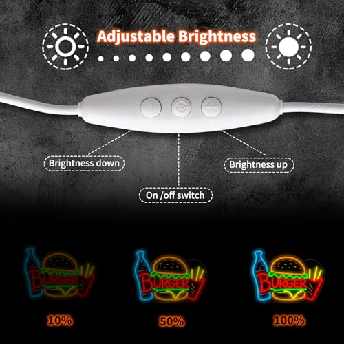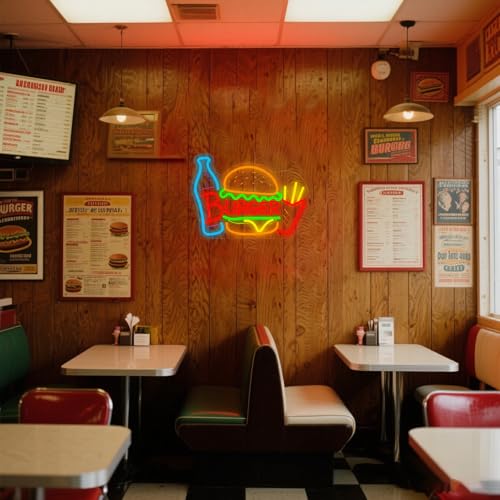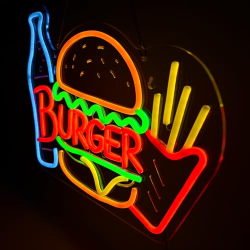 Burger & Fries Neon Sign - Retro Dimmable Fast Food LED Light, Restaurant & Dining Room Wall Decor, Snack Bar Sign, Hamburgers Party Decorations
