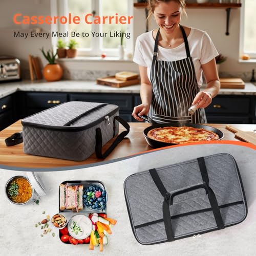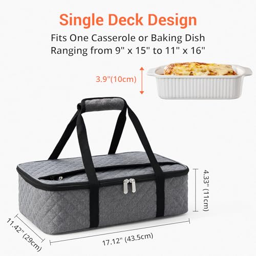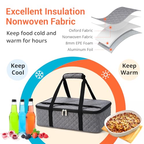 Casserole Carrier - Large Portable Insulated Food Carrier for Hot or Cold Food, Lunch Tote Warmer or Cooler Bag, Lasagna Lunch Bag for Work Picnic Hiking Beach - Fits 16" x 10"Baking Dish-Grey