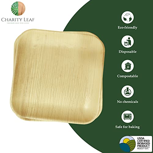 Charity Leaf Disposable Palm Leaf 9" Square Plates (50 pieces) Bamboo Like Serving Platters, Disposable Boards, Eco-Friendly Dinnerware For Weddings, Catering, Events