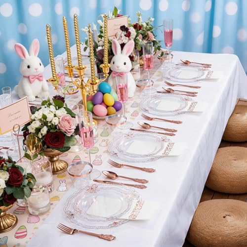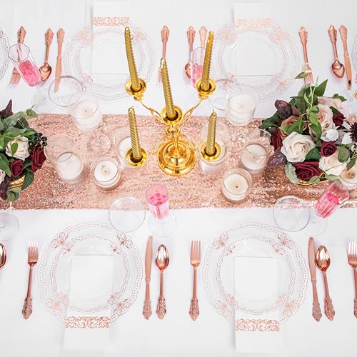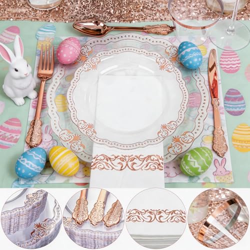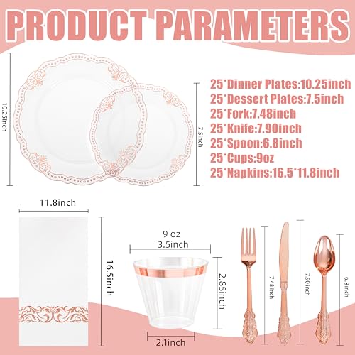 Ciaell 175 PCS Rose and Gold Plastic Plates - Fancy Rose Gold Disposable Dinnerware Set with of 50 Plates, 25 Knives, 25 Forks, 25 Spoons, 25 Cups, 25 Napkins for Wedding & Party & Easter