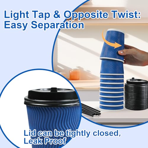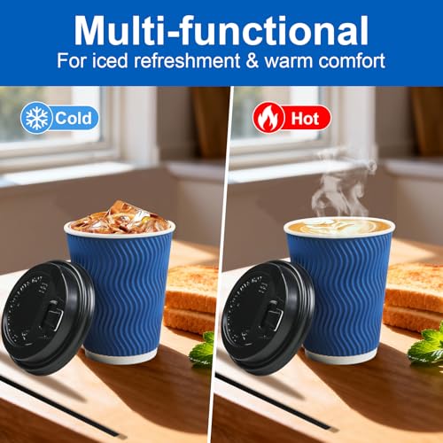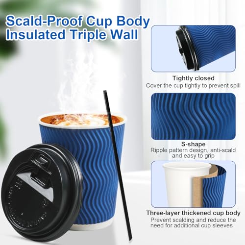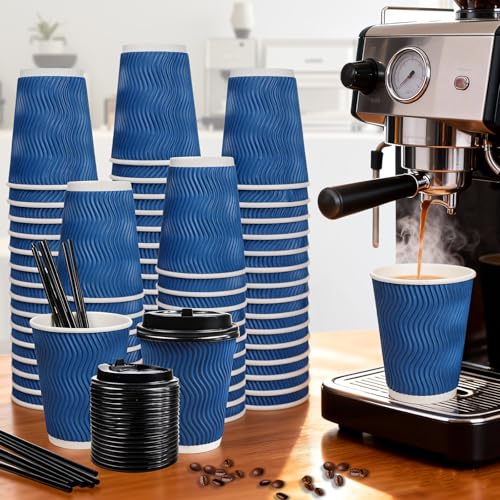 Coffee Cups, 100 Pack 12 oz Disposable Blue Insulated Paper Cups, Corrugated Kraft Ripple Wall Cup, Comes With Lids and Straws, Suitable for Hot and Cold Drinks