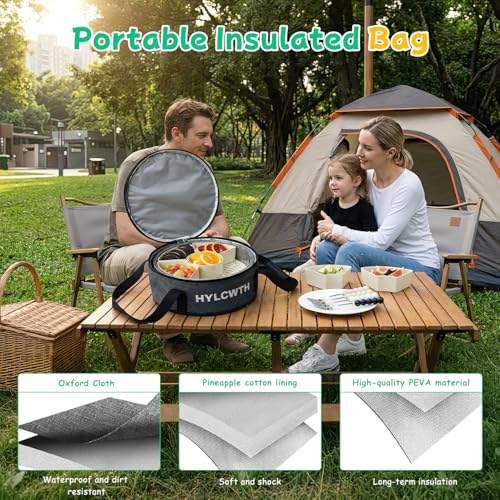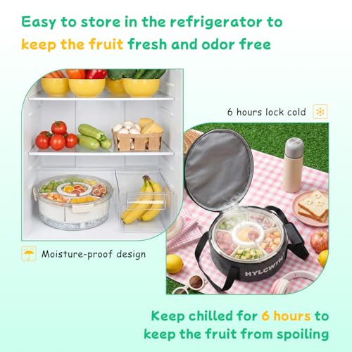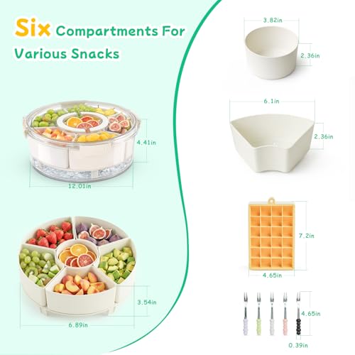 Divided Serving Tray with Lid and Handle, Rounded Snackle Box with 6 Compartments and Chill Base for Fruits, Candy, Veggie, Travel Snack Container with Portable Insulated Bag & Ice Cube Tray & 5 Forks