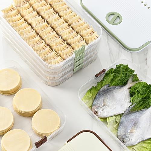Dumplings Storage with 4 Layers, Stackable with Buckle, Lid & Handle for Cookies Wonton Donuts Box Organizer For Fridge, White-Green