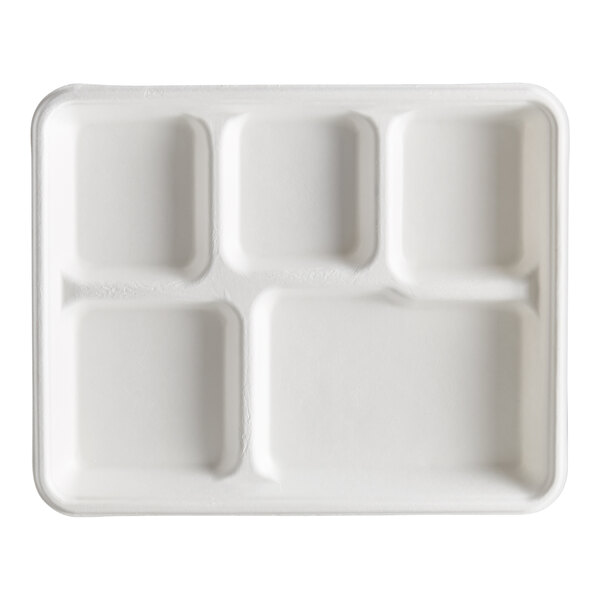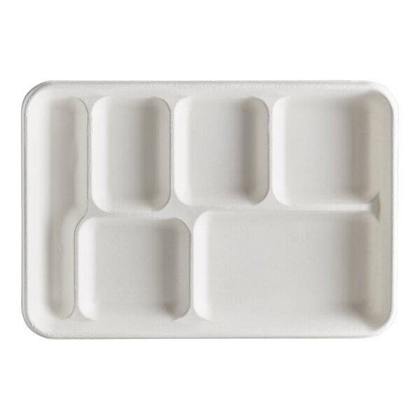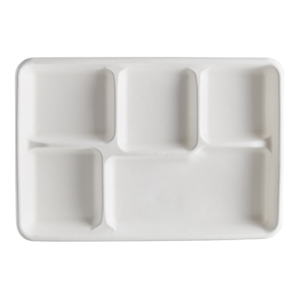 Quantity: 300/Case | Shipping Weight: 15.41 lb. | Length: 7 3/8 Inches | Width: 6 1/2 Inches | Height: 1 1/2 Inches | Color: White | Design: Unprinted | Features: Commercially Compostable Microwavable | Material: Molded Fiber Plant Fiber | Number of Compartments: 2 Compartments | Shape: Rectangle | Type: Compartment Trays