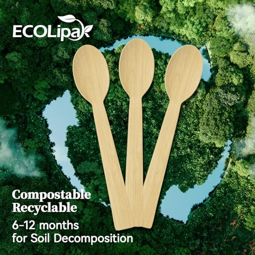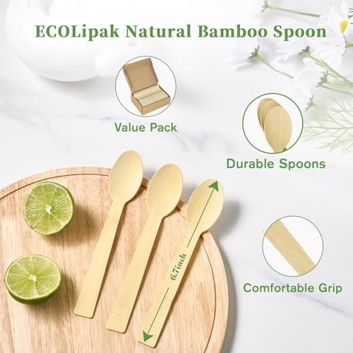 ECOLipak 300 Count Bamboo Spoons Disposable, 6.7 Inch No Splinters Heavy Duty Bamboo Disposable Compostable Spoons for Party, Wedding, Camping, Traveling, Family Dinners, Large Events