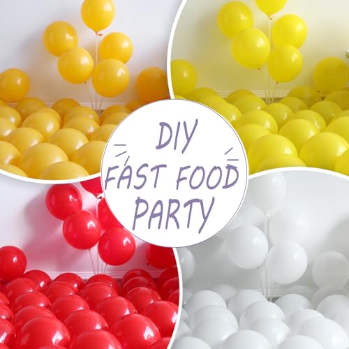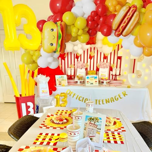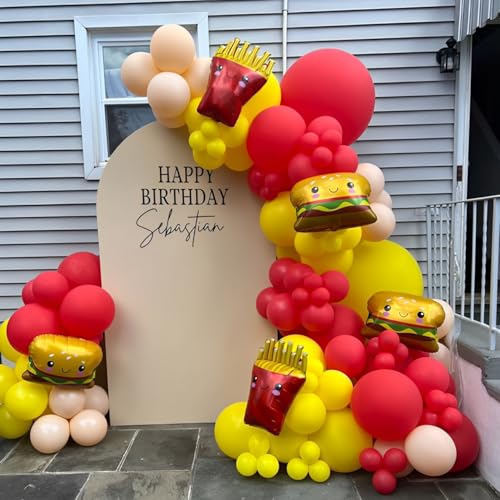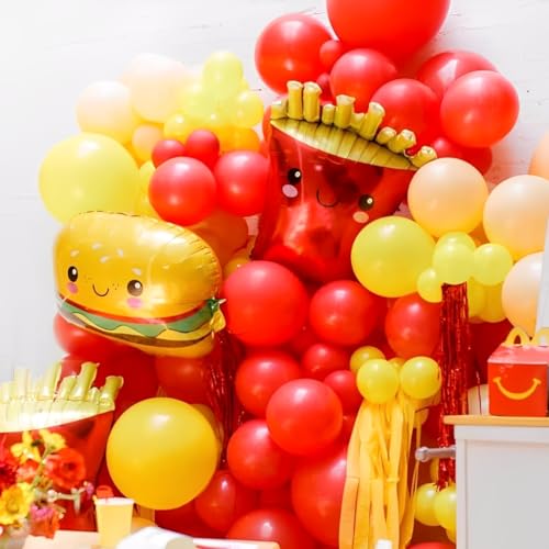 Fast Food Hot Dog Party Decorations 140PCS Red Yellow Balloon Garland Acrh Kit with Hamburger French Fries and Hot Dog Foil Balloon for Junk Fast Food Picnic Themed Birthday Baby Shower Party Supplies