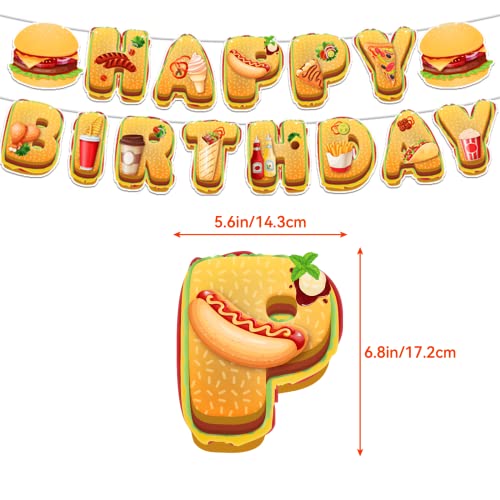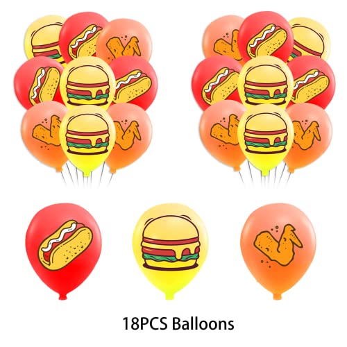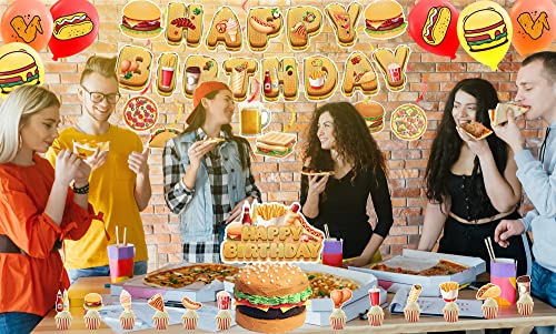 Fast Food Party Decorations French Fries Pizza Hamburger Fried Chicken Hot Dog Party Supplies Includes Birthday Banner Cake Cupcake Toppers Spirals Balloons for Fast Food Birthday Decorations