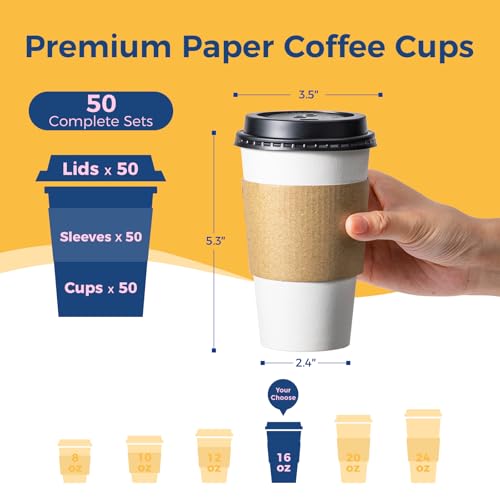 Fit Meal Prep Disposable Coffee Cups with Lids, Sleeves, Leak-Proof To Go Coffee Cups with Lids, Durable Paper Cups for Hot Beverage, Home, Office, Party 50 Pack 16 oz