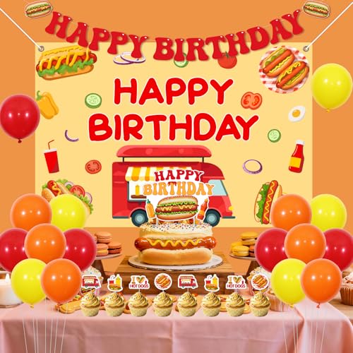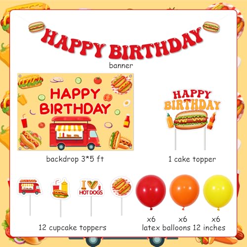 Funmemoir Hot Dog Birthday Party Decorations - Happy Birthday Banner, Backdrop 5*3ft, Cake & Cupcake Toppers, Balloons for Fast Food Hot Dog Bar BBQ Sausage Theme Party Supplies