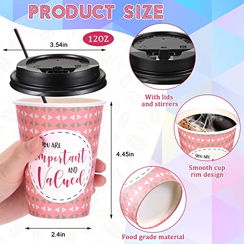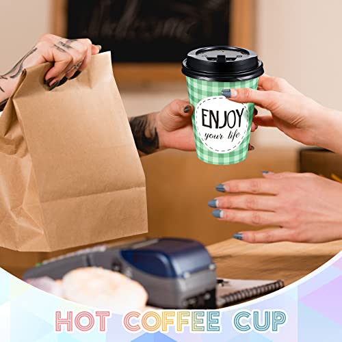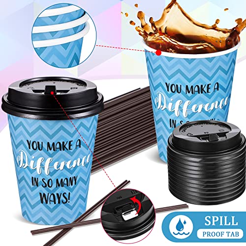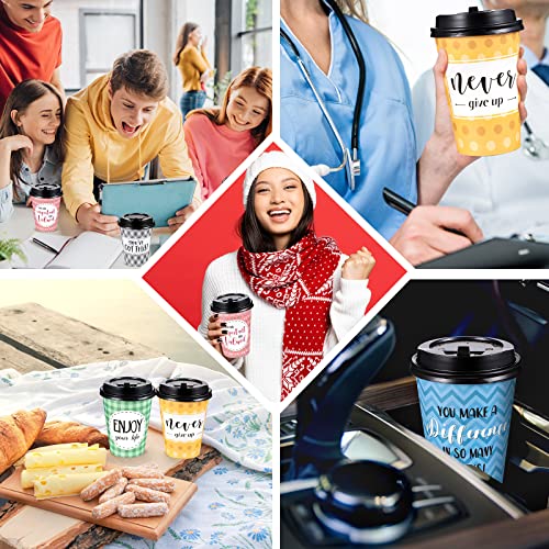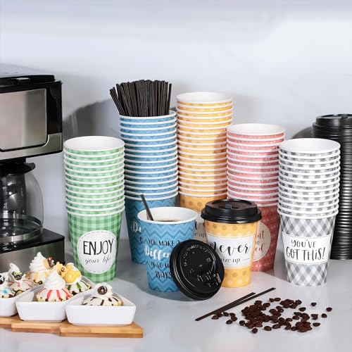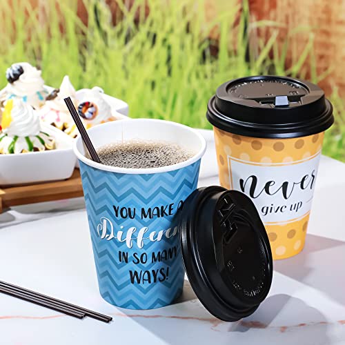 Gerrii 100 Pack Disposable Coffee Cups with Lids and Straws, Motivational Paper Hot Cups with 6 Quotes and Designs for Water, Juice, Coffee, Tea, Home, Shop Cafe(12 oz)