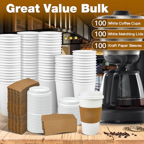 Ginkgo 100 Pack 16 oz Disposable Coffee Cups with Lids and Sleeves Leak-Proof White Paper Cups, Insulated To Go Hot Beverage Cups, Coffee Bar Accessories