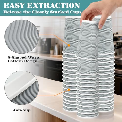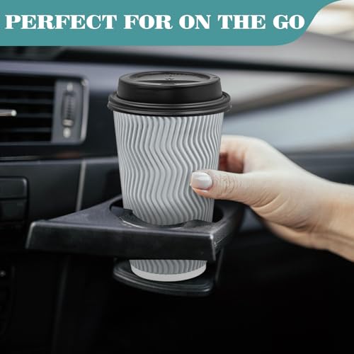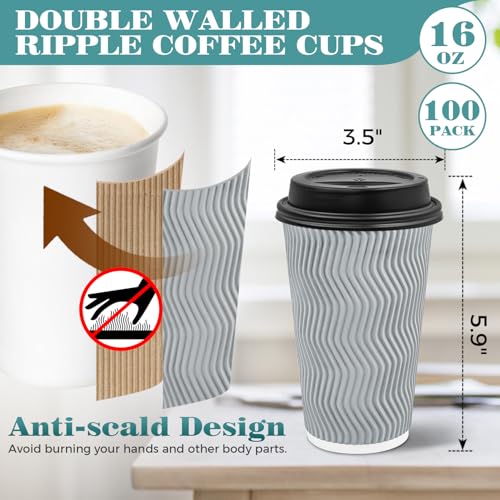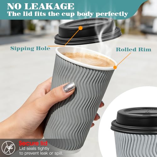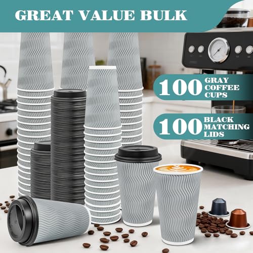 Ginkgo 100 Pack 16 oz Disposable Insulated Coffee Cups With Lids, Double-Walled Ripple To Go Paper Travel Cups for Hot Drinks - Gray