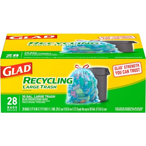 Glad Trash Bags, Large Drawstring Garbage Bags, 30 Gallon Blue Trash Bags for Large Kitchen Trash Can or Recycling, 28 Count - Packaging May Vary